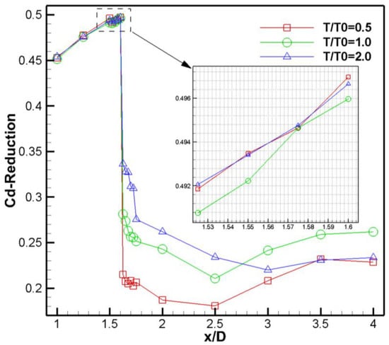 - When x/D ≤ 1.5, the drag reduction rate will vary slightly with the increase of T/T0, reaching above 45%. Conversely, when x/D ≥ 1.75, a small drag reduction rate will be found (less than 30%). As T/T0 increases, the drag reduction rate will first increase and then decrease with the maximum value taken around T/T0 = 2.0.