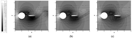 The above variations are explained in combination with flow fields of varied x/D. As can be seen from Figure 14, there is a significant variation in the flow fields when x/D = 1.6 and 1.625. More precisely, when x/D = 1.6, the airfoil surrounded by the wake vortex of the cylinder dominates the flow field. When x/D = 1.625, a counter-rotating and alternately shedding vortex street are formed between the cylinder and the airfoil.