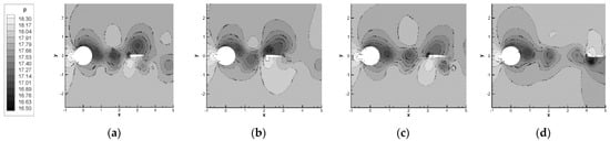 The pressure contour of flow fields in different x/Ds when T/T0 = 0.5 is displayed in Figure 17. As x/D increases, the strength of the Karman vortex street also increases. It can be seen that the time-average drag coefficient increases slightly after x/D = 1.625. When x/D increases further, the Karman vortex street will expand downstream and become stabilized. At the same time, its resulting low-pressure area has a weakening effect on the cylinder. Although the space between the cylinder and the airfoil is large enough to accommodate the third low-pressure area at x/D = 4.0, the drag reduction effect is less affected for its large gap with the trailing edge of the cylinder. Therefore, the drag reduction rate of the tandem configuration remains unchanged after a small rise.