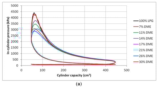The DME share in the mixture, together with the engine speed, were defined as the variables. Figure 10 shows the courses of the close indicator charts. For the developed diagrams of the average in-cylinder pressures, the value of the indicated mean effective pressure (imep) was determined by using the arithmetic mean according to the formula: