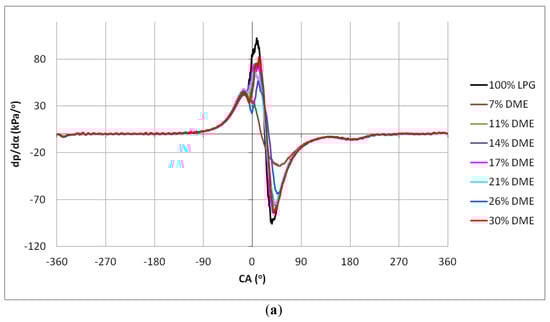 Regardless of the engine speed, the value of the maximum pressure is displaced in relation to the TDC. This displacement, however, is not even. In the case of the 7% DME share, there was a significant acceleration of the moment of the maximum pressure value. Starting from the DME shares of 11% and 14%, there was a visible tendency to delay the occurrence of the pressure maximum value. With 17% and 21% DME, there can be noticed an acceleration in the occurrence of the maximum cylinder pressure, and for 26% DME, the moment of maximum pressure occurrence was significantly delayed. The share of 30% DME was characterized by the acceleration of the angle of occurrence of the maximum pressure. The mixtures featuring DME shares of 11%, 14%, 26% and 30% resulted in a similar maximum pressure angle as the reference fuel (LPG). The remaining LPG–DME mixtures had angles of the maximum pressure that significantly differed from the values achieved for LPG.