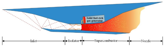 In 2016, Xia et al. [12] proposed a new type of combined hypersonic power system based on SSRJ, see Figure 2. The SSRJ is composed of a gas generator, an inlet, an isolator, a combustor, and a nozzle. There is a self-sustaining combustion of the fuel-rich solid propellant in the gas generator, and the generated fuel-rich gas is injected into the combustor for mixing and combustion with the supersonic air to further release energy. They accomplished a stable operation of the SSRJ in supersonic air, showing a feasible SSRJ [13].