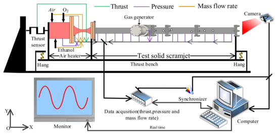 The direct-connect test platform of the National University of Defense Technology was used to carry out the test, see Figure 3. The experiment platform is composed of four parts: the air heater, the measurement and control system, the thrust bench, and the SSRJ under test. The air heater is a three-element (alcohol, oxygen, and air) combustion heater. The simulated flight condition is 5.6 Ma at 25 km.