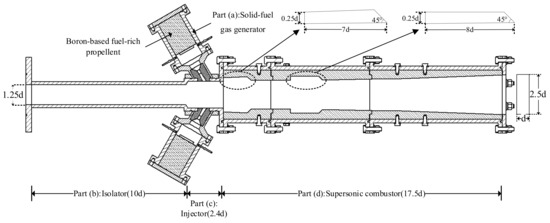 Powered hypersonic flight (Ma > 5) is currently a research hotspot in the field of aerospace, with the scramjet being an ideal propulsion equipment for this purpose [1,2,3,4]. While most of the current research is based on liquid fuels, the scramjet that employs solid fuel (SSRJ) has many advantages, including simple structure, high energy density, low cost, and safety [5,6,7,8]. Due to this, the SSRJ has become one of the most promising engine types for hypersonic future vehicles.