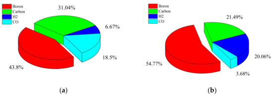 (a) Gas generator: Two gas generators are arranged symmetrically, using boron-based fuel-rich solid propellant. The propellant is self-sustained and burned in the gas generator to produce the fuel-rich gas. The thermodynamic calculation [34] results of the main energy-containing components and energy proportions in the propellant combustion products, are shown in Figure 5. It can be seen that the energy release ratio of the gas components in the fuel-rich gas only accounts for about 25% of the total energy, and the remaining 75% is stored in carbon and mostly boron particles. This shows that the overall performance of the SSRJ strongly depends on the particle combustion efficiency.