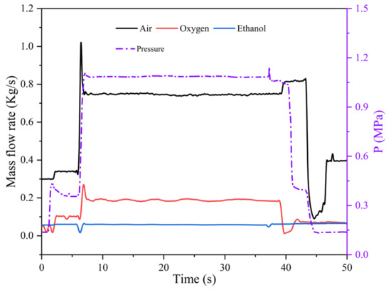Whether the air heater can work stably is very important to the test. Figure 6 presents the mass flow of each component and the pressure in the air heater measured during the test. It can be seen that the air heater was stable, i.e., its parameters remained basically unchanged during the test, indicating that it can provide stable flight conditions. One point that needs to be explained is that the ethanol is used for combustion to achieve the purpose of heating the air, so that the temperature of the air is the same as the total temperature of the airflow under simulated flight conditions. In addition, the oxygen content of the heated air is consistent with the ambient air.