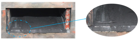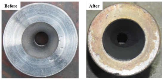 Figure 18 shows a photo of the inner wall surface at the outlet of the combustor after the test. It can be clearly observed that a large number of condensed phase product are deposited on the inner wall surface. The deposition is evenly distributed on the wall surface, indicating that the particles have a greater penetration depth compared to the gaseous components in the fuel-rich gas, that they can collide and rebound within the combustor, and that are evenly distributed throughout the combustor. The particles deposition also shows that the particles combustion efficiency in the fuel-rich gas is indeed not high.