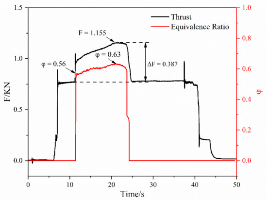 where and are the air and the fuel-rich gas mass flow rates, respectively; and the underscore denotes the stoichiometric state. Figure 10 presents the bench thrust and equivalence ratio vs. time curves registered during the test. The equivalence is less than 1, indicating that the combustion was in an oxygen-rich state (the closer to 0, the more air it contains). Figure 10 also shows that thrust and equivalent ratio changed synchronously, i.e., both present an initial sudden and then gradual increase, indicating that there is almost no ignition delay when the fuel-rich gas is injected into the combustor and is mixed with supersonic air. In addition, the equivalence ratio gradually increased from 0.56 to 0.63, and the thrust gradually increased with the mass flow of fuel-rich gas, indicating that the test SSRJ configuration has the potential for a wide operating range.