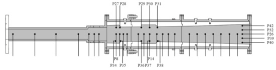 Figure 11 shows the distribution and pressure taps naming for the tested SSRJ. Figure 12 shows the wall pressure curve on the center of the flow channel at different times during the test. It can be seen that, from the moment the air heater starts operating (~7.50 s), shock trains are established in the isolator to match the back pressure generated by the combustion in the combustor. After the gas generator is successfully ignited, the overall pressure distribution along the wall gradually increases with time. This is due to the slow increase of the fuel-rich gas mass flow and the combustion efficiency during the test, which leads to an increase in heat release along the combustor and in turn its wall pressure.