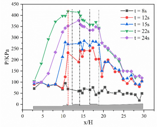 Pressure distribution along the wall surface of the SSRJ at different times.