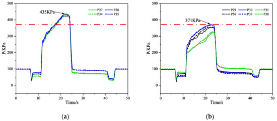 (a) Internal pressure of the cavity at the first position symmetrically arranged in the combustor; (b) internal pressure of the cavity at the second position symmetrically arranged in the combustor.
