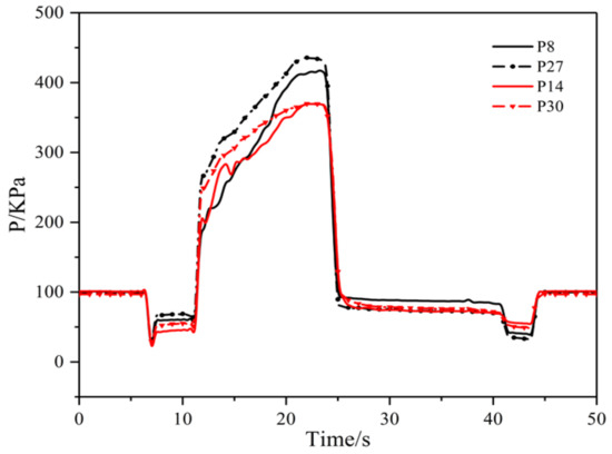Figure 13 shows the internal pressure of the cavity symmetrically arranged in the combustor, where (a) is the cavity at the first position along the flow direction and (b) is the cavity at the second position. It can be seen that the internal pressure of the symmetrically arranged cavity is basically the same, indicating that the flow field in the combustor achieves a symmetrical distribution. The change trend of the pressure curve at each position is consistent with the change of the thrust and gas generator curves, also showing that the test SSRJ can adapt to the changes of the fuel-rich gas mass flow.