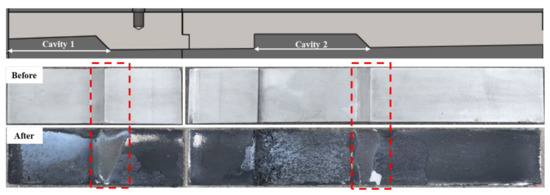 Figure 15 shows the structure of the cavity before and after the test. It can be seen that the bottom wall of the first cavity is ablated, while the bottom wall of the second cavity is complete. While the back edge of both cavities is ablated, the first cavity is more serious. This suggests that the heat release is concentrated around the first cavity, which is consistent with the analysis presented above. It should be emphasized that the heat generated at the first cavity is mainly produced by the combustion of the gas components in the fuel-rich gas. On the other hand, a larger number of particles are deposited in the second cavity compared to the first cavity. We speculate that this may be due to the large particles’ inertia and penetration depth, which causes them to collide in the flow channel, bounce back and then move to the wall before flowing into the second cavity.