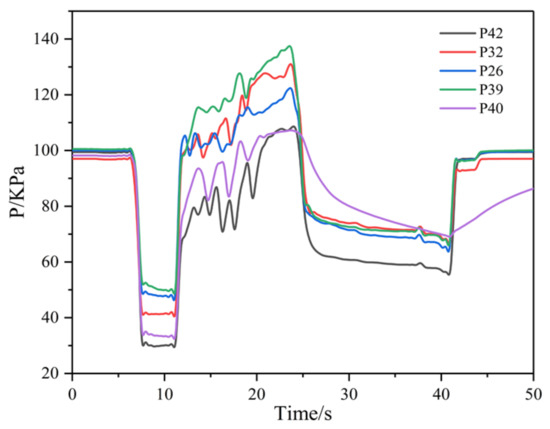 Figure 16 shows the pressure changes of the five pressure measuring points arranged at the outlet of the combustor. It can be seen that the outlet pressure distribution during SSRJ operation is not uniform. In particular, there is low pressure at the wall and the center of the flow channel, and high-pressure in the area between these two. This is most obvious in the later stage of the test. Figure 16 also evidences that the combustor achieves symmetrical combustion of the fuel-rich gas, and that the combustion area is not close to the wall or in the center of the combustor. On the one hand, it can be seen that the thermal load on the wall of our combustor is relatively light, which is favorable to the long-term operation of the SSRJ. Moreover, Figure 16 shows that the fuel-rich gas in the combustor cannot diffuse to the center of the flow channel, and that the mixing between the fuel-rich gas and supersonic air needs to be enhanced.