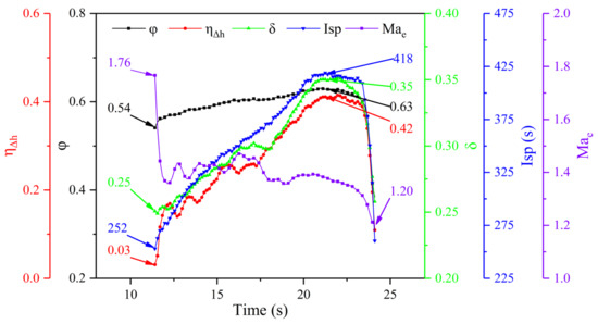 Using the above-described analysis method, we calculated the performance curve of the SSRJ during the test, see Figure 19. It can be seen that during the test, the change trend of each parameter is basically the same, and the performance of the SSRJ continuously increases up to the last stage, where it stabilizes. The Mach number at the outlet of the combustor decreased during the test from 1.76 to 1.20, indicating that the outlet was in a supersonic state. Due to the deposition of the gas generator throat and the change of the propellant combustion area, the equivalence ratio increased from 0.54 to 0.63. At the beginning of the test, the combustion efficiency was only 0.03, indicating the existence of an ignition delay of the fuel-rich gas. However, the fuel-rich gas and supersonic air quickly established combustion in a short time. The combustion efficiency gradually increased during the test, reaching a maximum of 0.42. We conclude that this is caused by the expansion of the combustion area from the cavity to the center of the combustor, which is also consistent with the operating characteristics of multi-cavity liquid scramjets.