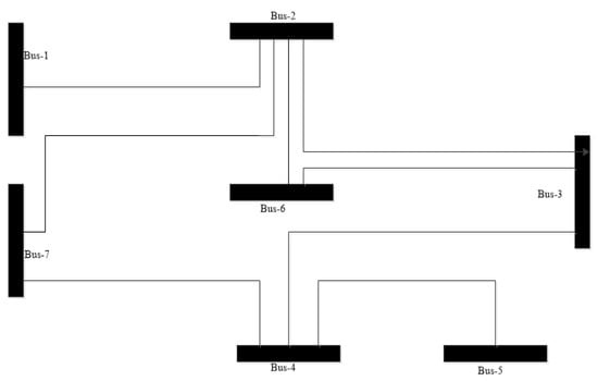 In Figure 4, the IEEE-7 bus system demonstrates the connectivity of the nodes, in which bus-2 has the greatest number of incident branches, although bus-3 and bus-4 have three neighboring branches. In this case, due to the limitations of the PMU channels, the decision regarding PMU placement should take the bus with the greatest number of connected branches into consideration, whereas, in Figure 4, the IEEE-7 bus network has other buses, namely 1, 5, 6, and 7, that have only one and two connected neighboring nodes. Therefore, in the case factor, PMU channel limits the proposed methodology only when considered the bus that has more connections. In an IEEE-7 bus network, bus-2 comprises four incident branches (2-1, 2-3, 2-6, 2-7), which means that a PMU must have five channels to give complete coverage to the connected buses and must also include bus-2 itself. Nevertheless, it is assumed that if a PMU has a smaller numbers of channels than the number of installed buses, the branch combinations for every bus need to be determined using the following proposed equations. The proposed equation for the PMU channel limits is given in Equation (8) [].