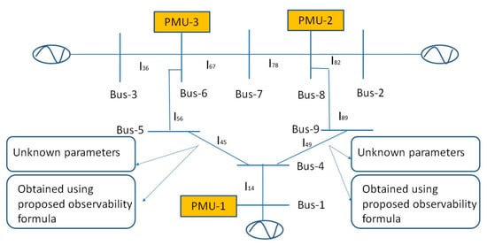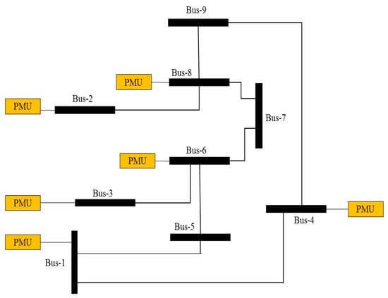 In Figure 5, the IEEE network is composed of nine buses. For a complete observable network, a total number of six PMUs are required to give entire monitoring to all the buses, with at least two installed PMUs. In the case of PMU malfunction, more than half of the PMUs have to be installed in relation to network size. Single PMU outage modeling for every installed PMU bus is derived from the proposed modeling of PMU outage on IEEE-test systems, as follows: