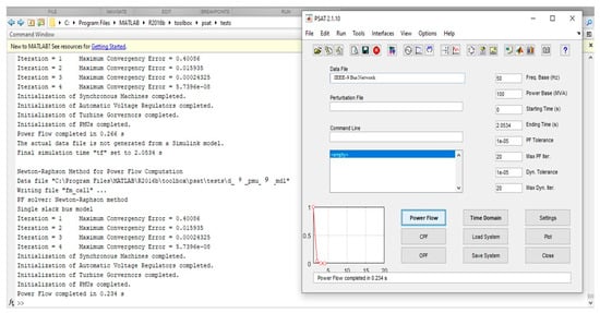 The Newton–Raphson method is used to solve the power flow analysis of the IEEE-9 bus network in order to acquire information regarding all the network parameters. After different iterations, the power flow report is completed in 0.24 s, and it is considered the optimum report to use for the unknown parameters of branch lines I45 and I49 of the IEEE-9 bus network by the proposed methodology. In Figure 8, the direct connections of the PMUs with the voltages and current lines are obtained from the power flow analysis on the IEEE-9 bus network