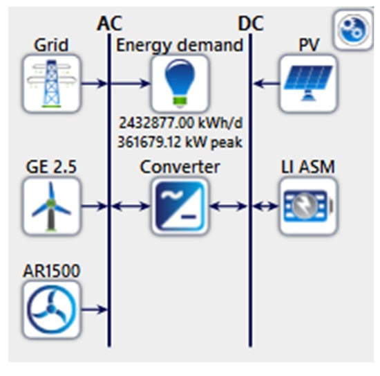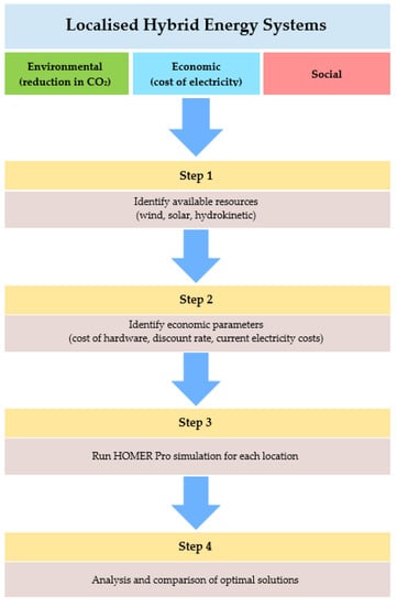 This study utilises HOMER Microgrid software [35] to identify and compare the most financially viable hybrid system in terms of the Net Present Cost of the solution. HOMER is a simulation model that simulates a viable solution for all possible combinations of the equipment chosen to be included within the system. Net Present Cost is the chosen metric by which to measure hybrid systems because, while a fully renewable system would be the ideal case scenario, the reality is that cost plays a pivotal role in deciding whether or not to pursue a project.