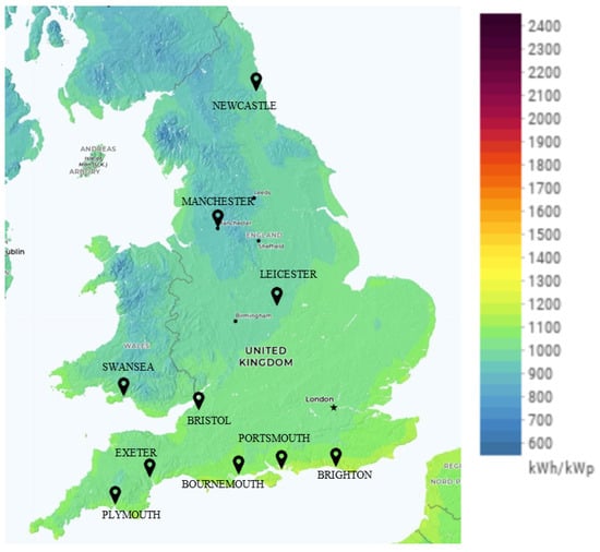 Modelled locations were chosen based on their current energy demand and any comparative advantage in resources that may be available. Specifically, only locations within the top 25% of electricity demand were considered, according to government statistics on sub-national electricity usage [36]. The comparative advantages in terms of resources were identified by analysing data from global wind and solar atlases [37,38], along with Admiralty tidal atlases for the UK waters [39]. By considering these factors, the chosen locations are shown in Table 1, with the annual and daily consumption figures along with the comparative advantage. For any tidal or wind turbines modelled, the specific location is within 20 miles of the city, given that the tidal resource is rarely in the city itself, and the wind resource can be complex. Scotland has not been included in the choice of locations because the renewable resource already produces 31.8 TWh per annum, the equivalent of 97.4% of the gross electricity consumption of the country [24]. The exception to these location selection criteria is Exeter. Exeter has been simulated as an example of a smaller electrical load demand.