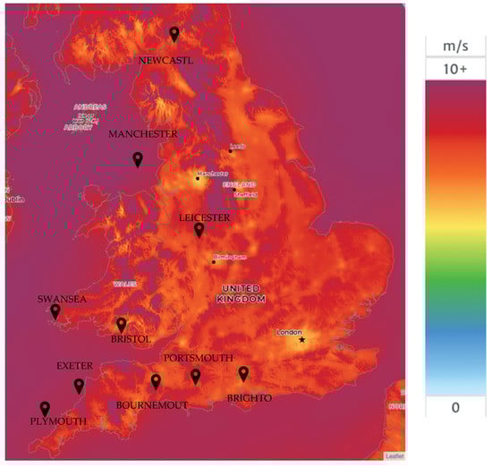 The solar and wind atlas data are shown visually in Figure 1 and Figure 2, with the scale for the intensity of each resource shown at the top right of the figure. It can be seen that Bournemouth, Brighton and Plymouth are in close proximity to higher solar irradiance, while Manchester, Newcastle and Leicester are close to extensive wind resources.