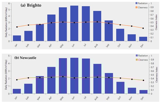 Monthly solar GHI resource for (a) Brighton and (b) Newcastle.