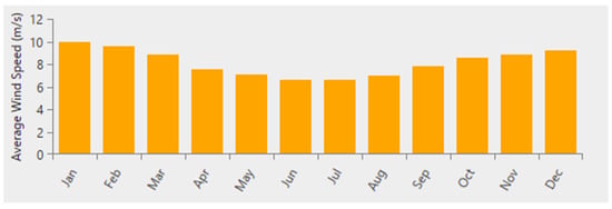 To calculate the wind turbine output, HOMER first calculates the wind speed at the hub height of the turbine. This is conducted by applying the logarithmic law, using Equation (9) [35];