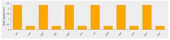 However, this flow rate cannot be taken as a simple average flow rate value for the spring and neap values. This is because power is produced from hydrokinetic turbines in a cubic relationship relative to the velocity, as shown in Equation (7) [31];