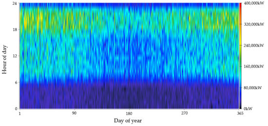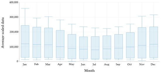 HOMER was programmed to optimise the system based on different energy demand profiles, namely residential, community, commercial and industrial. For this model, the community demand profile has been used, since this is the demand that is experienced within cities. A peak month of demand of January is also chosen, since this models the higher winter demand experienced in the UK. The demand profile can be scaled to fit any electrical demand, based on the daily average consumption of the location. These are the values shown in Table 1 within the Methodology section. A visual representation of both the daily and monthly electrical loads can be seen in Figure 7 and Figure 8. Figure 7 shows a data map of Portsmouth, where it can be seen that there are small peaks in demand between 08:00 and 11:00, with the highest demand being experienced between the hours of 17:00 and 23:00. Figure 8 shows the corresponding monthly demand profile as a box plot so as to show the real fluctuations that will be experienced day to day, instead of simply an average value. The demand follows a clear trend, with winter months demanding greater energy and summer months having lower demand. However, the most visible difference is the spread in values for summer and winter, with the winter maximum values being considerably higher, with a peak demand of 358,420.72 kW. The electricity price is taken as GBP 0.195 per kWh, as this was the average cost of electricity in the UK between January and June 2020 according to Ofgem statistics [41].