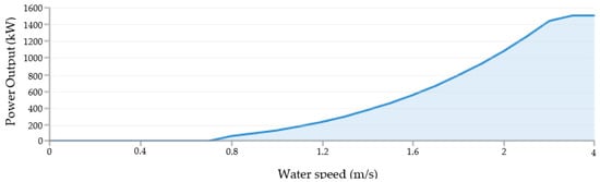 Once the hub height wind speed has been calculated, HOMER uses the power curve of each respective turbine to calculate the output, assuming that at any value above or below the minimum and maximum speeds the turbine produces no power. Since the tidal speed change is assumed to be negligible with depth, a logarithmic law is not applied to the hydrokinetic resource. As such, the hydrokinetic turbine output is calculated using the power output at the corresponding tidal speed based on the power curve of the turbine, as shown in Figure 10.