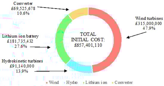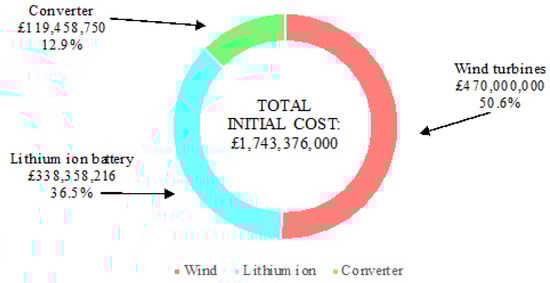 A fully detailed breakdown of the initial capital costs for each hybrid system is also given in Appendix B, with two cases being shown in Figure 11 and Figure 12. Figure 11 shows the breakdown for Manchester, including costs for the wind turbines, converter and lithium ion battery storage. All of the simulated locations except for Bristol have similar breakdowns to Manchester in that HOMER calculated that the lowest Net Present Cost system was made up solely from these three generation and storage components. Figure 12 shows the breakdown for Bristol, which also includes tidal turbines within the lowest Net Present Cost system.