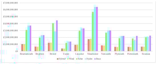 Decarbonisation is now becoming a principal issue within the economic policies of developed countries, with the UK having set out a new plan to reduce its greenhouse gas emissions by 68% by the end of the decade compared to 1990 levels [1]. The importance of decarbonisation can be viewed on a global or domestic basis. From a global standpoint, climate change is having a dramatic effect on many planetary functions, such as fuelling extreme weather systems or causing food shortages through changing rain patterns [2,3,4]. The effect on animal life is also accelerating [5], with increased carbon dioxide concentrations and higher temperatures causing sea water to become more acidic [6]. Domestically in the UK, air pollution can increase the risk of many chronic and acute respiratory diseases and other cardiovascular health issues [7,8]. By reducing the emissions through decarbonisation methods, public health improves and the cost of health services reduces as well, with a current estimated cost of GBP 1.4–3.7 billion per year in London [9]. This study investigates the potential of wind, solar and hydrokinetic generation methods acting as a localised hybrid system for the supply of clean energy to specific cities in the UK. The hybrid system can include any of: the national grid, wind turbines, hydrokinetic turbines, solar panels, converters and lithium ion batteries for energy storage [10]. By identifying the most financially viable solutions, informed decisions can be made in terms of the location and makeup of the hybrid solutions. This offers a more systematic and achievable approach to the decarbonisation of cities, utilising the proximity of generation to reduce infrastructure costs and transmission losses.