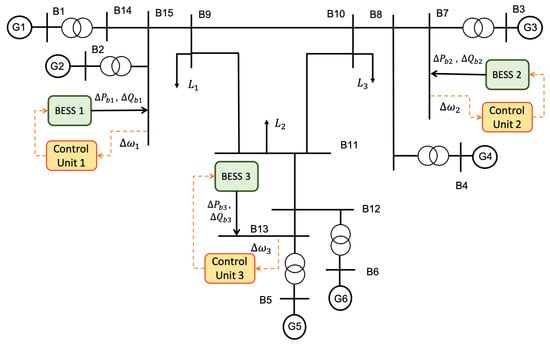 Sparsely interconnected power systems experience inter-area oscillations. The inter-area oscillations, with a frequency of 0.1–2.0 Hz, occur as generators in one area oscillate against the rest of the power system. These oscillations typically happen due to weak connections or high-power transmission between the areas [1] and can damage the stability of the power system. Hence, small-signal stability is one of the most challenging issues for current and future power grids, especially in renewables. There are several ways to damp or suppress these oscillations, including the use of power system stabilizers (PSSs), improving the generators’ exciters [2,3], and improving transmission lines in the power systems [4]. The American Physical Society (APS) has proposed a long-term plan to the U.S. Department of Energy (DOE) with a particular focus on renewables’ integration into the power system and the importance of BESSs to stabilize the future power grid [5].