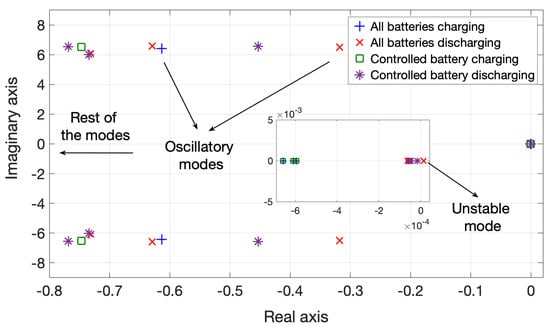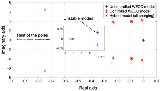 The eigenvalues of the case study model with WECC model for battery dynamics.