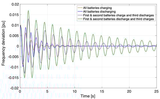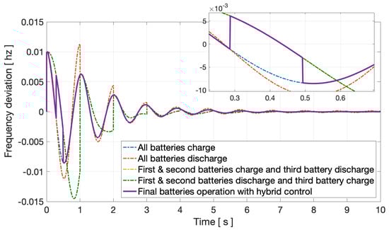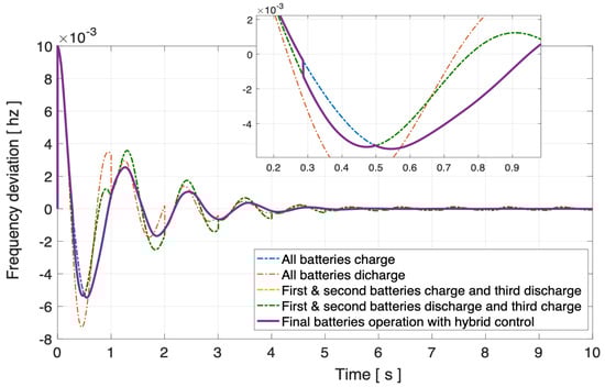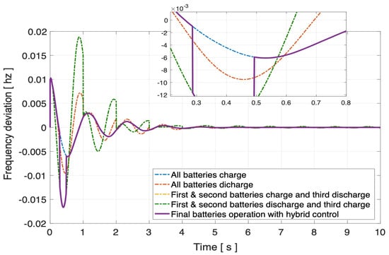 For the sake of simplicity, we only show the batteries’ operations for four scenarios out of the total eight cases. These scenarios are as follows: all batteries are charging; all batteries are discharging; first and second batteries are charging and the third battery discharging; first and second batteries are discharging and the third battery is charging. In Figure 5, Figure 6 and Figure 7, the dotted lines represent the generator’s frequency deviations for these four scenarios. The generator’s frequency deviations under the optimal switching policy with the hybrid controller are shown with solid purple lines. At the end of each time interval, the initial conditions of all scenarios are updated based on the selected scenario.