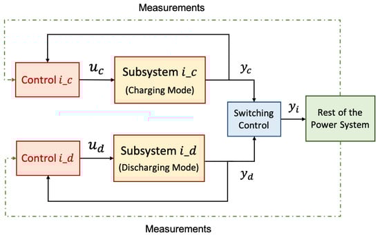 Subsystem ith of our case study has two state-space models for charging and discharging scenarios. Thus, the control strategy should be able to frequently switch between charging and discharging operating conditions to optimize the battery’s operation and reduce the frequency deviations of the system, simultaneously. The proposed control system schematic, for the battery in the area i, is presented in Figure 4.