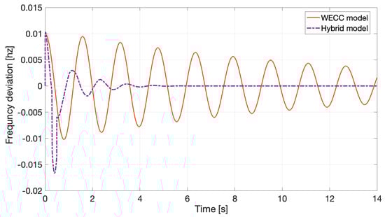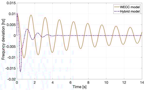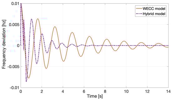 The results show (i) a notable improvement in the frequency deviations in the case study system for both the hybrid and WECC models, () the hybrid model has better frequency damping, compared to the WECC model, () in spite of the WECC model’s higher degree of freedom in control inputs, the control design for the hybrid model is more convenient, due to the weak inter-connectivity of the system under hybrid dynamics of the battery; and () the hybrid model frequency damping time depends on the switching time intervals.