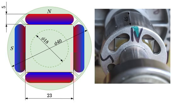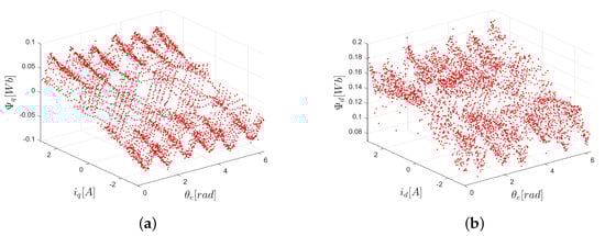Several methods may be used to create numerical data representing the surfaces , : starting from detailed 3D modeling of the motor magnetic field, ending with observers of a different type, for example, as described in [27,28,32,33]. All these methods produce data degraded (to a certain degree) by noise or outliers. An exemplary set of data is presented in Figure 1. It was obtained from a permanent magnet synchronous motor with B–202–C–21 rotor embedded permanent magnets manufactured by Kollmorgen. The diagram and the photo of the rotor are presented in Figure 2. The motor parameters are given in Table 2.