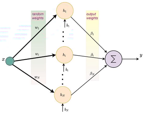 It is typical for a standard ELM approach that the weights and the biases are selected at random, according to the uniform distribution in [34,35]. The training data for an n-input ELM form a batch of M samples and corresponding desired outputs . It is assumed that each input is normalized to the interval [0,1]. The batch of M samples is transformed by an ELM with hidden neurons into M values of output: