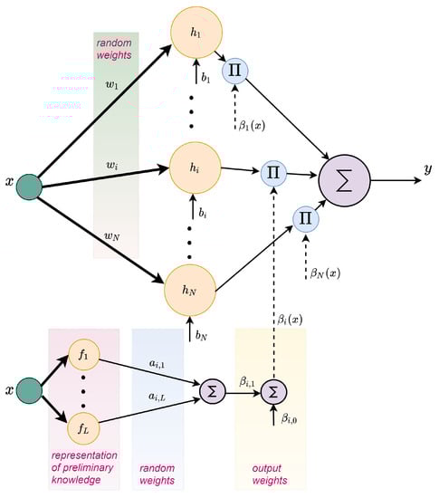 Hence, Formula (9) is equivalent to a standard ELM structure with hidden neurons equipped with activation functions , , , , …, , . Sigmoid functions with randomly selected parameters represent a random, non-linear transformation of inputs into the feature space, while , code an assumed knowledge about the data structure. We expect that using this knowledge directly inside the network will reduce the total number of neurons required to obtain the desired modeling accuracy, compared with a standard ELM.