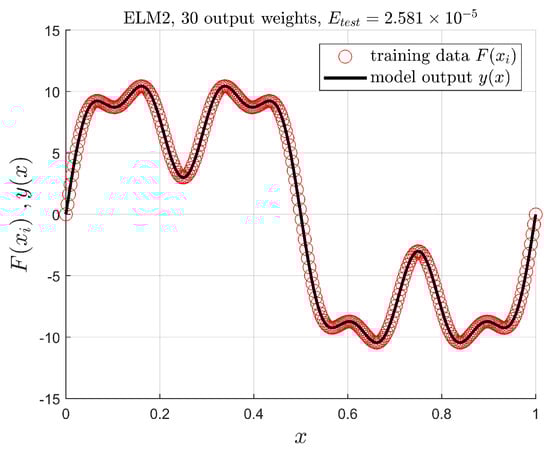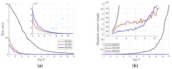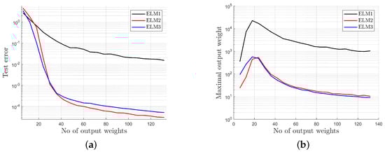 A standard ELM possesses the universal approximation property [34,35,37]. This means that by increasing the number of hidden neurons, we may decrease the approximation error arbitrarily. Unfortunately, the large number of neurons increases the probability that some columns of become almost co-linear, and generates numerical difficulties and high output weights. Tikhonov regularization is supposed to help, but it is not easy, or may even be impossible, to find a compromise value of parameter C. Several approaches to solve this dilemma were proposed (see [38,39,40] and the references therein), but none of them is perfect.