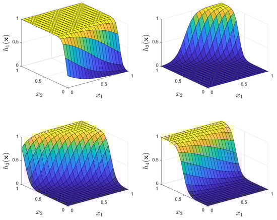 Next, the biases are selected to guarantee that the range of each sigmoid function is sufficiently large. The minimal value of the sigmoid function in the unit hypercube is achieved at the vertex selected according to the following rules: , , , and equals , while the maximum value is achieved at the vertex: , , , and equals . Therefore, if the biases are selected at random from intervals,