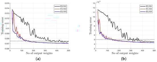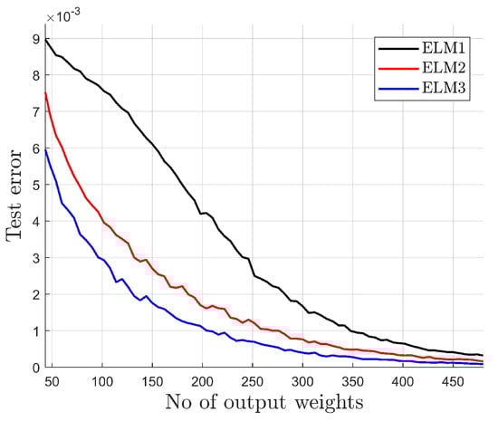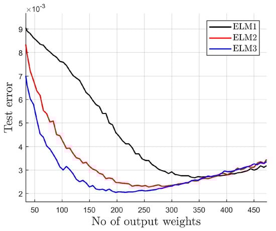 We compare the networks with the same number of the output weights, so, if we use N hidden neurons in ELM1, the corresponding ELM2 has , and ELM3— neurons.