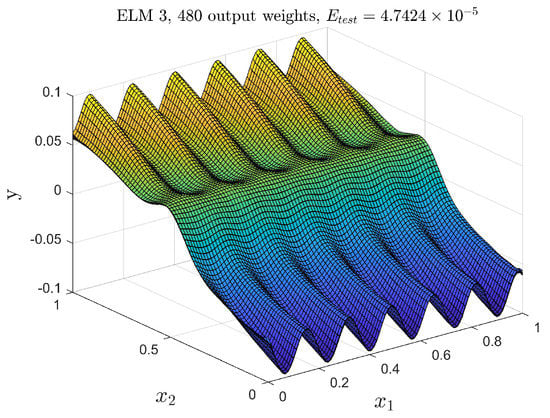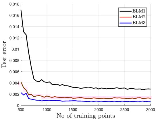 The advantage of modified networks (ELM2 and ELM3) becomes more visible when the information about the surface is poorer. Figure 14 presents the test error as the function of the number of training points for , , , .