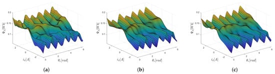 The surfaces generated by the networks described in Table 3 are presented in Figure 17 and Figure 18. Of course, currents and position are rescaled to the original range in amperes and radians. Application of networks ELM2 and ELM3, where the knowledge about the motor construction is used, allows us to smooth the modeled surface, to reduce the number of extremes, and to obtain a continuous transition at . The models obtained from the modified networks (ELM2 and ELM3) are more regular, with a smaller number of extremes.
