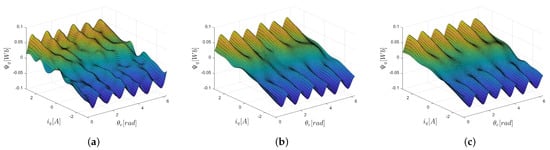 Unfortunately, in a real permanent magnet motor, the flux distribution is never perfectly sinusoidal, even if the manufacturer claims it is. Such flux distortions cause higher harmonics in no-load EMF and torque deformations. The influence of motor construction on the flux distribution, EMF, and torque are well described [21,22,23]. Especially, for interior permanent magnet motors, where the magnets are embedded inside the rotor, deformation of flux distribution is non-negligible and the simplified model (1) is unacceptable. In this case, each flux component is a non-linear function of current and rotor position [24], so a more reliable model is [25]: