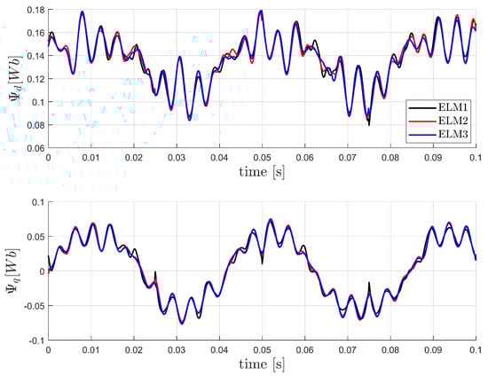 The time history of the flux generated for a given current–position trajectory is presented in Figure 19. The flux obtained from the modified networks (ELM2 and ELM3) is continuous for , while the one generated from the standard network (ELM1) is not. Therefore, the model generated from ELM1 violates physical principles of motor operation, while modified networks benefit from the knowledge coded in functions and included in the network.