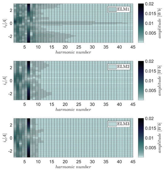Amplitude of harmonics in q-axis flux generated from models ELM1–3 for a constant speed and several constant values of q-axis current.