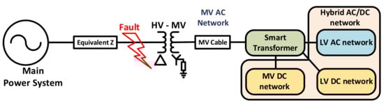 The effectiveness of the approaches suggested in this paper is studied and demonstrated using a test network modeled in a computational simulation environment. An over-view of the test network is depicted in Figure 1, comprising a hybrid AC/DC distribution grid connected to an upstream MV AC grid through a grid-tied ST. A MV cable models the equivalent impedance in the MV AC grid between the ST and the HV AC grid. The MV AC grid is connected to a High-Voltage (HV) grid, modeled using a Thevenin equivalent comprising an ideal three-phase voltage source in series with an equivalent impedance. This simplification is adopted because frequency variations that may result from grid faults in the power system are not relevant for the subjects under study in this paper. A DYn core type HV/MV transformer was considered to interface HV and MV AC grids, where a neutral earthing through an impedance was considered for the MV AC grid.