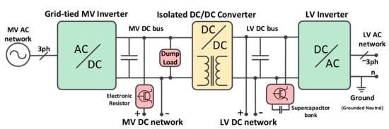 However, comparatively to traditional low-frequency magnetic transformers, the ST inherently presents stringent challenges regarding particular operation conditions involving overcurrents—namely overloads and short-circuits—since it is based on power electronic converters. Fault-Ride-Through (FRT) capabilities in ST are of upmost importance not only for the physical integrity of the ST itself but also for the continuity of supply of the hybrid AC/DC distribution grid derived from the ST itself. The development of FRT capabilities for electronic power converters, especially for distributed generation, has been extensively addressed in the literature [18,19,20,21,22]. The incorporation of FRT capabilities in Medium-Voltage (MV) inverters is also an important research topic [22,23,24,25]. Nevertheless, the inclusion of FRT capabilities in ST remains scarcely addressed in the literature, there being a single work on the subject to date, to the best of the authors’ knowledge [26].